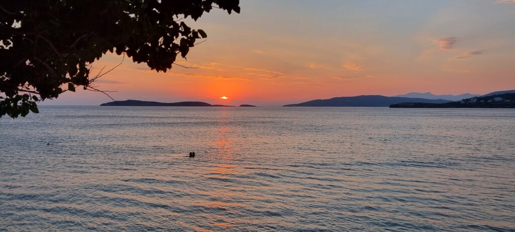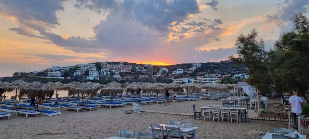 Abendessen in der typischen schon bekannten Taverne „Taverna Ag. Marina“ nahe unserer Unterkunft direkt am Meer mit Sonnenuntergang.