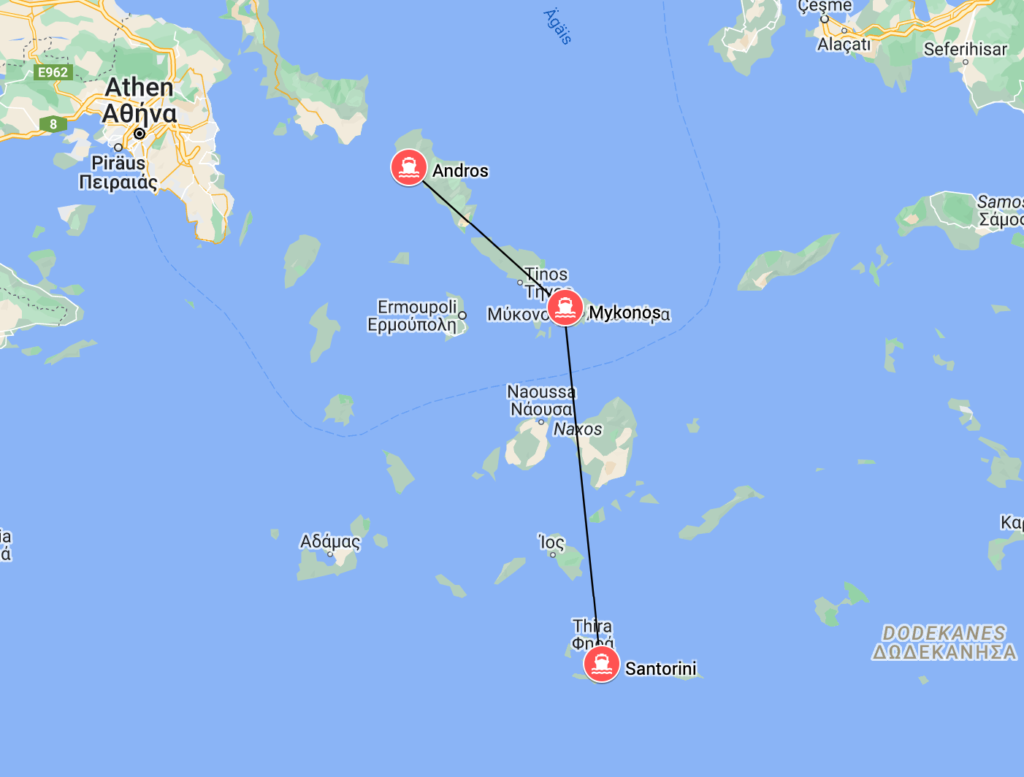 10:10 – 12:30 (2:20 Stunden) mit der Fähre nach Mykonos. Preis: € 76,70.-