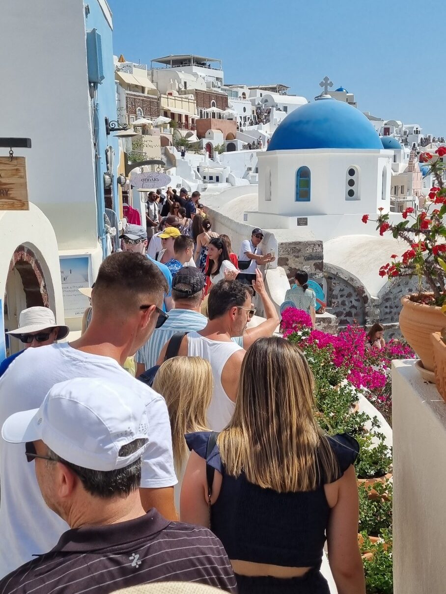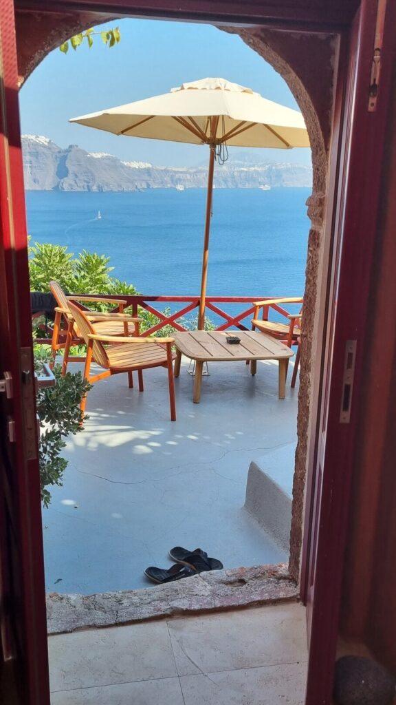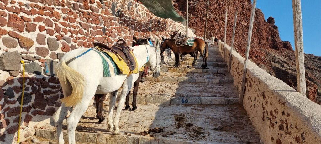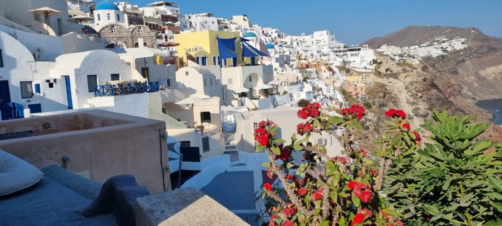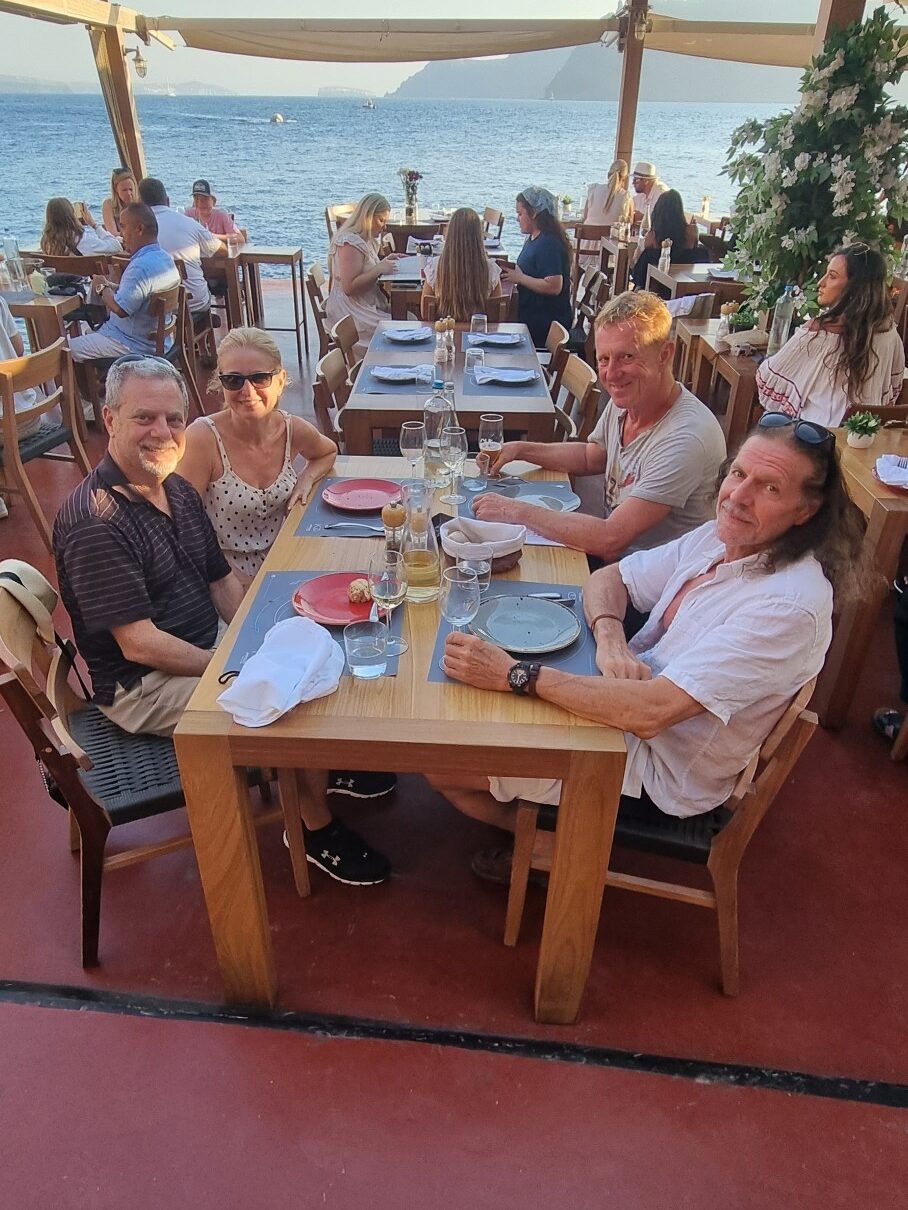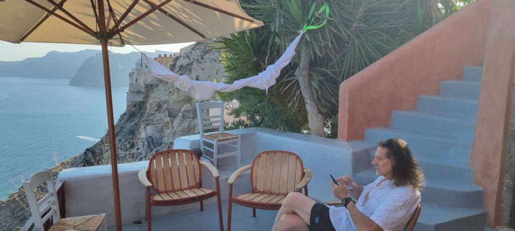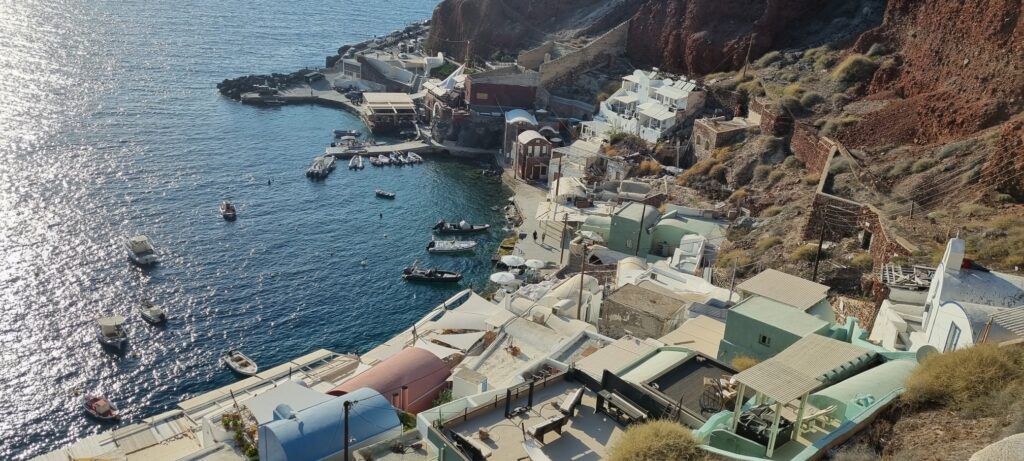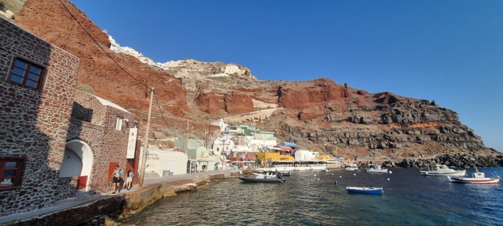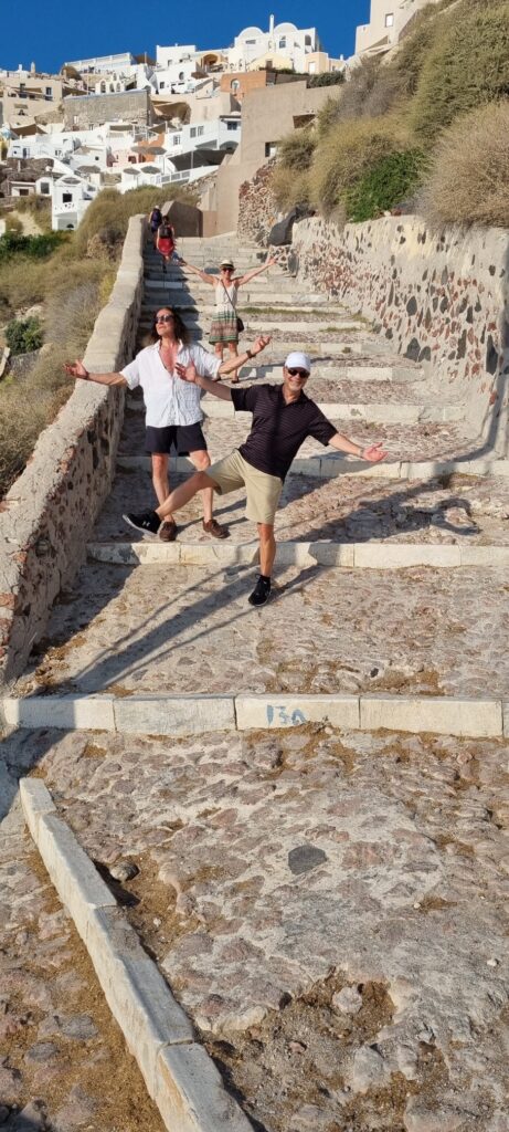 Um 18:15 hatten wir einen Tisch im Restaurant „Ammoudi Fish Tavern“ bestellt. Um 17:45 ging’s wieder einmal in vollem Sonnenschein die 242 Stufen hinab. Nach einem netten Abend natürlich wieder hinauf. Wie gestern natürlich ohne Sonnenschein aber dafür heute ohne einen Hauch eines Windes. Heisss !